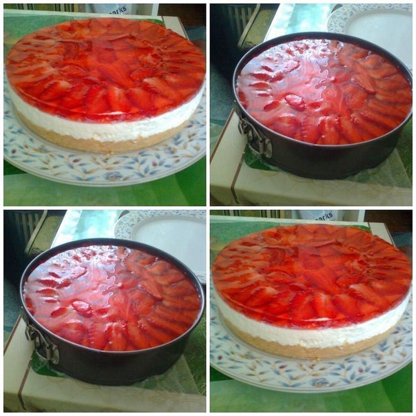 Чизкейк без выпечки с клубникой Ингредиенты: Для нижнего слоя: 300 г. обычного печенья 75 г. сливочного масла Показать полностью…Для крема: 500 г. крем-сыра 500 г. сметаны 30% 1 ст. сахара Ванильный сахар - по вкусу (у меня с натуральной ванилью) Желатин быстрорастворимый - 20 г. 0, 5 стакана кипятка Сок лимона - 2 ст. ложки Для верхнего слоя: 500 г. клубники 1 упаковка желе с клубничным вкусом Приготовление: 1.Для начала кипятим воду и разводим быстрорастворимый желатин (постоянно помешивая, чтобы не было комочков, кипяток нужно вливать в желатин, а не наоборот) 2.Дальше в другой посуде разводим желе согласно инструкции на упаковке и тоже постоянно помешиваем до растворения желатина. 3.Затем печенье измельчаем в блендере до мелкой крошки, высыпаем в миску, добавляем растопленное сливочное масло и тщательно руками перемешиваем до однородной массы. 4.В это время готовим форму (у меня разъемная 27 см.) Снимаем бортики, кладем на дно пекарскую бумагу (с запасом) и закрываем бортики. Лишнюю бумагу обрезаем, оставляя приблизительно 1 см. Бока закрываем полосками пекарской бумаги и скрепками. 5.Массу с печеньем выкладываем в форму, разравниваем и тщательно дном стакана или чем то другим (у меня деревянная толкучка) ровно прижимаем ко дну (можно оставить невысокий бортик) Форму ставим в холодильник. 6.В глубокую миску выкладываем крем-сыр, сметану, сахар, ванильный сахар и взбиваем до увеличения массы вдвое и растворения сахара (примерно 4-5 мин.), затем постепенно вводим остывший желатин при этом, не переставая взбивать крем. В самом конце добавляем сок лимона и еще раз взбиваем. Крем готов. 7.Достаем форму с печеньем из холодильника, выкладываем крем и снова ставим в холодильник. 8. В это время готовим клубнику (моем и раскладываем на бумажном полотенчике обсушиться) 9.Затем убираем плодоножки и режем клубнику пополам. 10.Смотрим, если желе уже остыло, достаем форму из холодильника, выкладываем клубнику на крем, ставим форму в холодильник на ровную поверхность, и ложкой аккуратно выливаем желе в форму. (Старайтесь лить желе на клубнику, а не на крем.) 11.Внимание! Не заливайте желе на торт теплым, а то желе смешается с белым кремом . Вот и все!