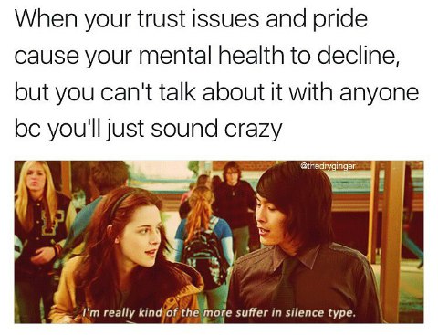 Когда твои проблемы с доверием и гордость ухудшили твое ментальное здоровье, но ты не можешь об этом говорить, потому что будешь звучать как сумасшедшая "Я из людей страдающих в тишине"
